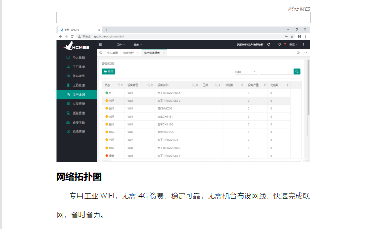 無需機臺布線,通過專用工業(yè)WIFI實現(xiàn)無線聯(lián)網(wǎng),穩(wěn)定可靠,相比4G網(wǎng)絡節(jié)省費用,比一般WIFI穩(wěn)定可靠。