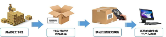 成品完工下線時,將成品條碼打印并粘貼到包裝上,倉庫人員先掃描生產(chǎn)訂單,并逐一掃描成品條碼,系統(tǒng)自動關(guān)聯(lián)生產(chǎn)匯報單生成產(chǎn)品入庫單。